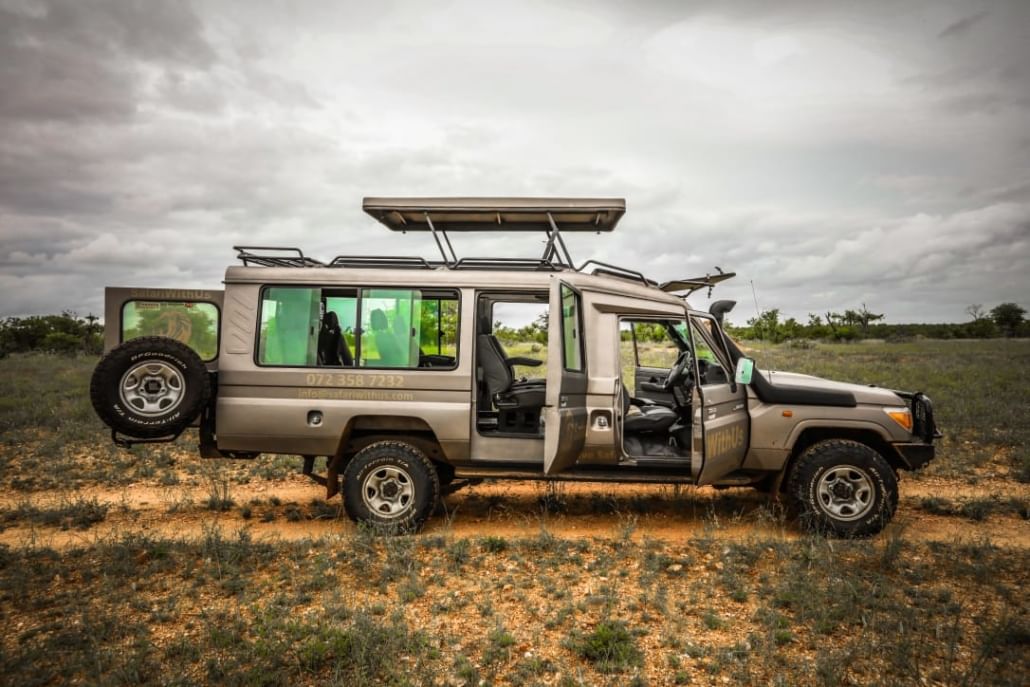 Travel in a custom-designed, pop-up roof 4x4 vehicle, perfect for game viewing and comfort.